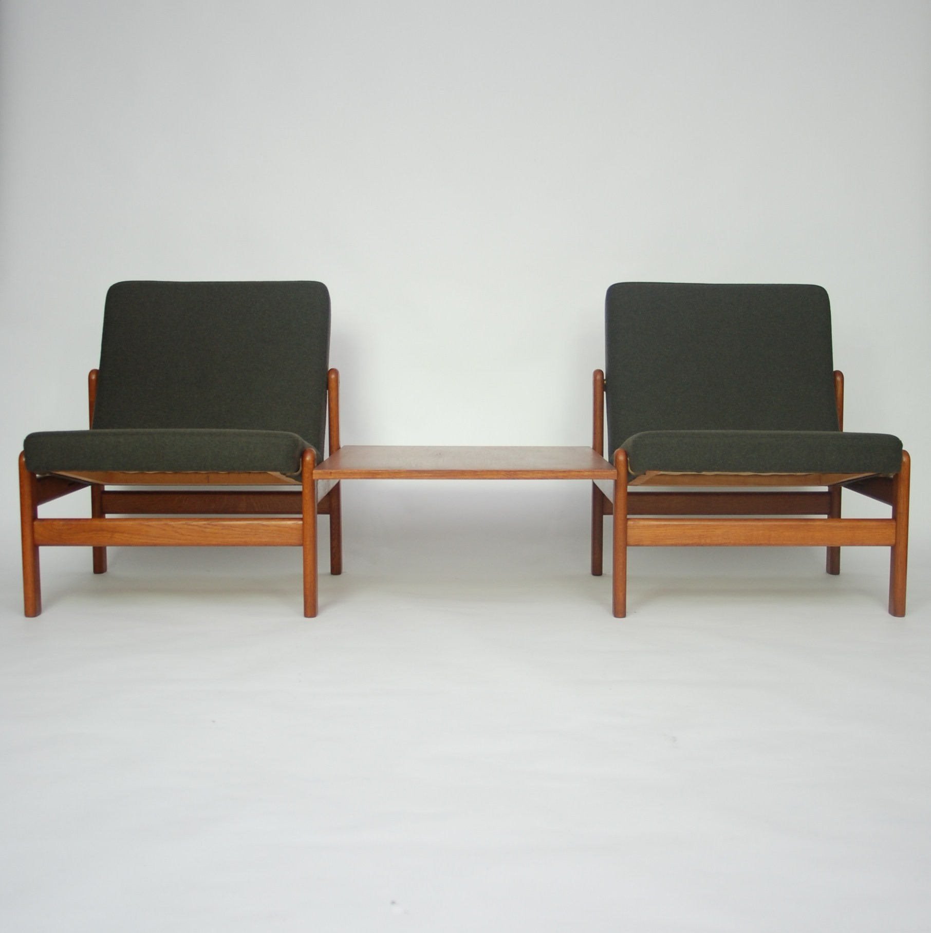Unikatowy, modułowy zestaw. Duński minimalizm. Całość stanowią dwa fotele łączone blatem. Mebel z wytwórni FDB dla której projektował Hans J Wegner oraz Børge Mogensen. Konstrukcja dębowa barwiona na tek. Mocowania mosiężne. Tapicerka wełniana. Produkt duński lat 60-tych.
