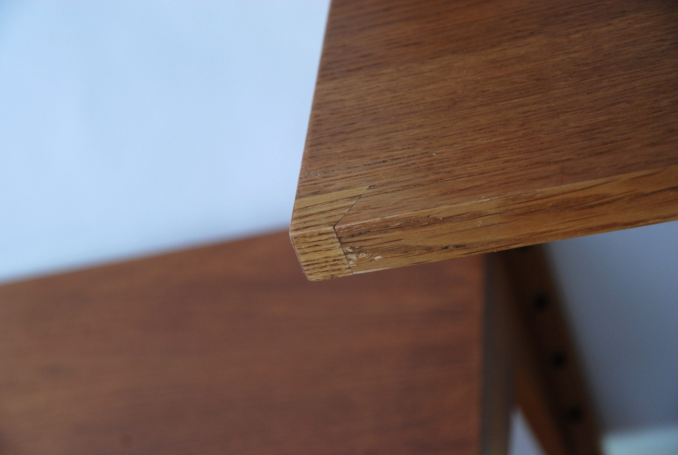 Stan dobry. Naturalne ślady czasu i użytkowania (rysy, otarcia i małe ubytki). W dwóch półkach naprawiany róg. Wady na ostatnich trzech zdjęciach. Świeże olejowanie.