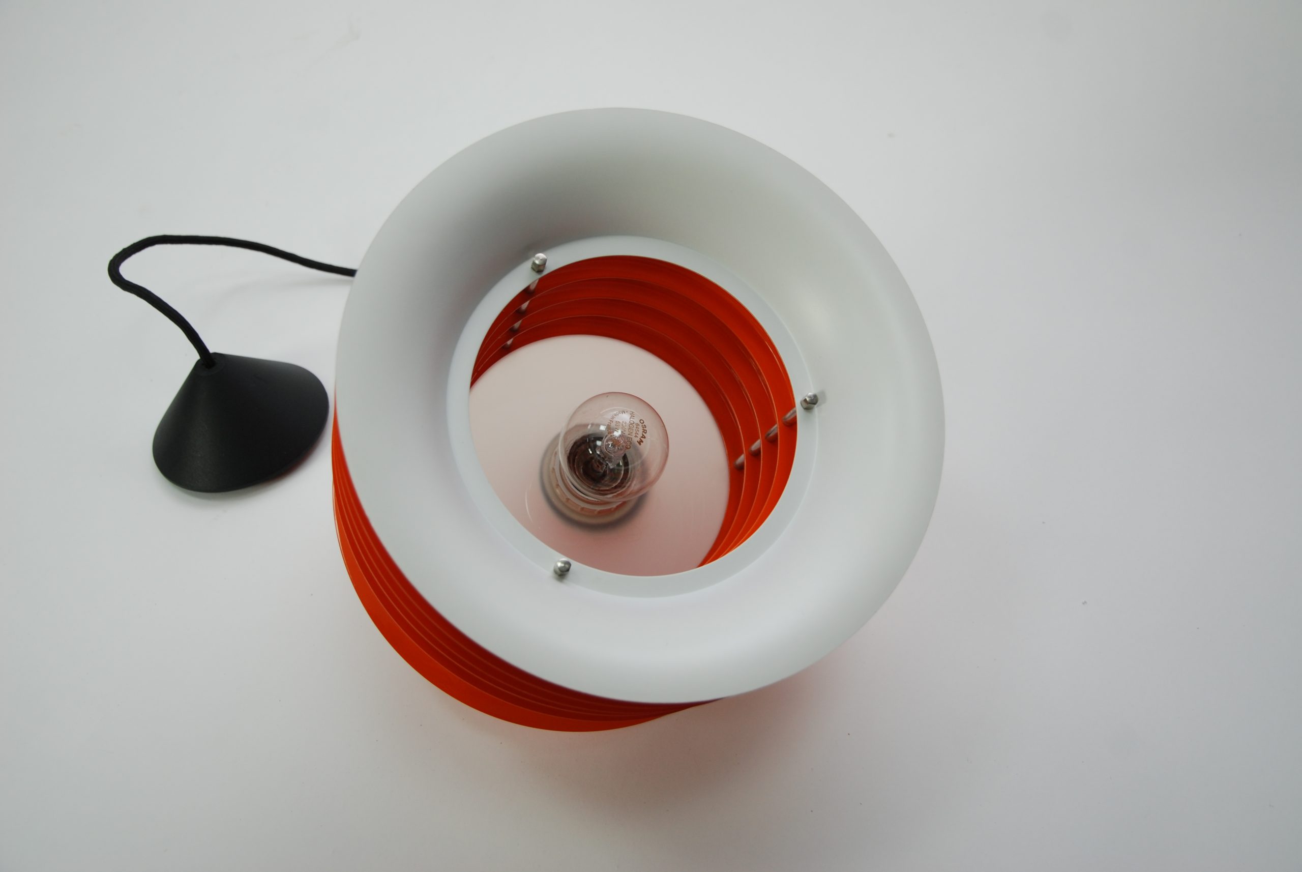 Bardzo ciekawa, pomarańczowa lampa. Aluminium. Na górze plexi. Przewód w oplocie.