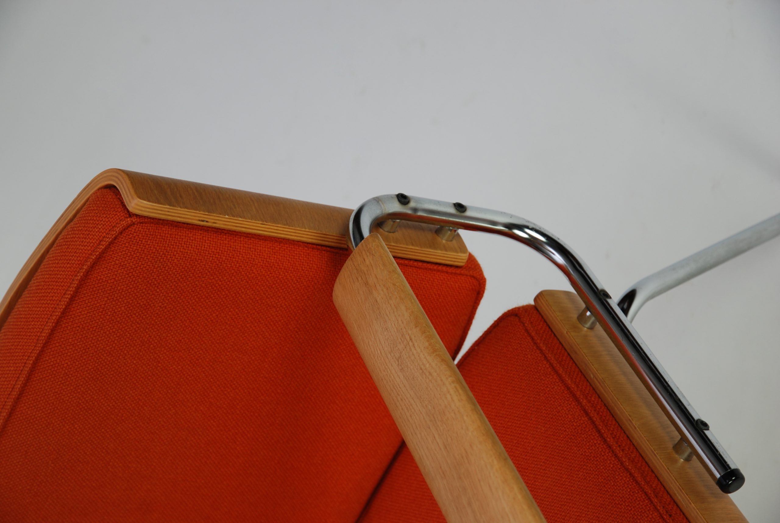 Ciekawe duńskie krzesło. Sklejka profilowana fornirowana dębem. Podłokietniki z litego dębu. Poszycie wełniane. Produkt duński lat 70-tych.