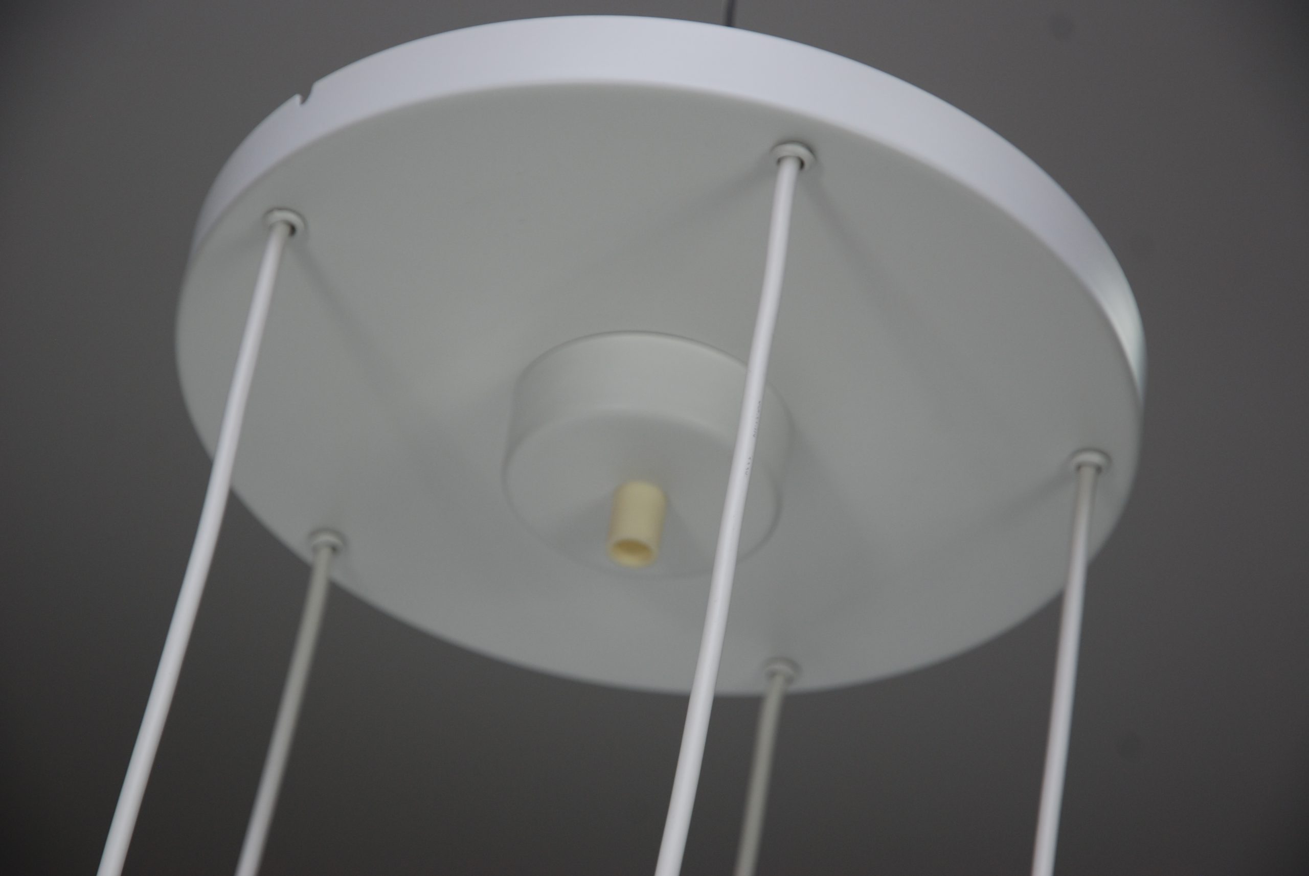 Stan bardzo dobry. Naturalne ślady czasu i użytkowania (na chromowanych elementach). Instalacja elektryczna wymieniona na nową. Nowe bakelitowe oprawki. Górny talerz z nowym lakierowaniem. Lampa gotowa do użytku. W komplecie tradycyjne żarówki (25 W).