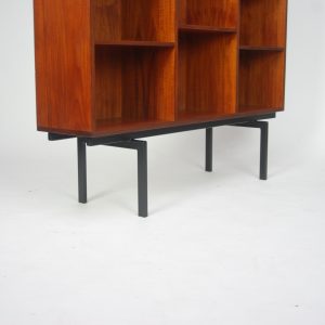 Stan bardzo dobry. Normalne ślady czasu i użytkowania. Rysy na górnym i dolnym blacie. Obicia na jednej krawędzi. Trzy dziurki na plecach. Wada nie widoczna po zagospodarowaniu. Obecnie dziurki są zaślepione (efekt na zdjęciach). Półki utrzymane wzorowo (bez wad). Nogi po renowacji (lakierowane proszkowo na czarny mat). Całość bardzo stabilna.