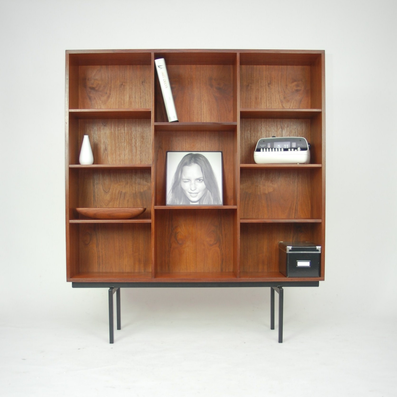 Minimalistyczny regał fornirowany tekiem. Wytwórnia LOVIG. Prosta, ale bardzo atrakcyjna forma. Wszystkie półki dowolnie regulowane. Mebel olejowany. Produkt duński lat 60-tych.