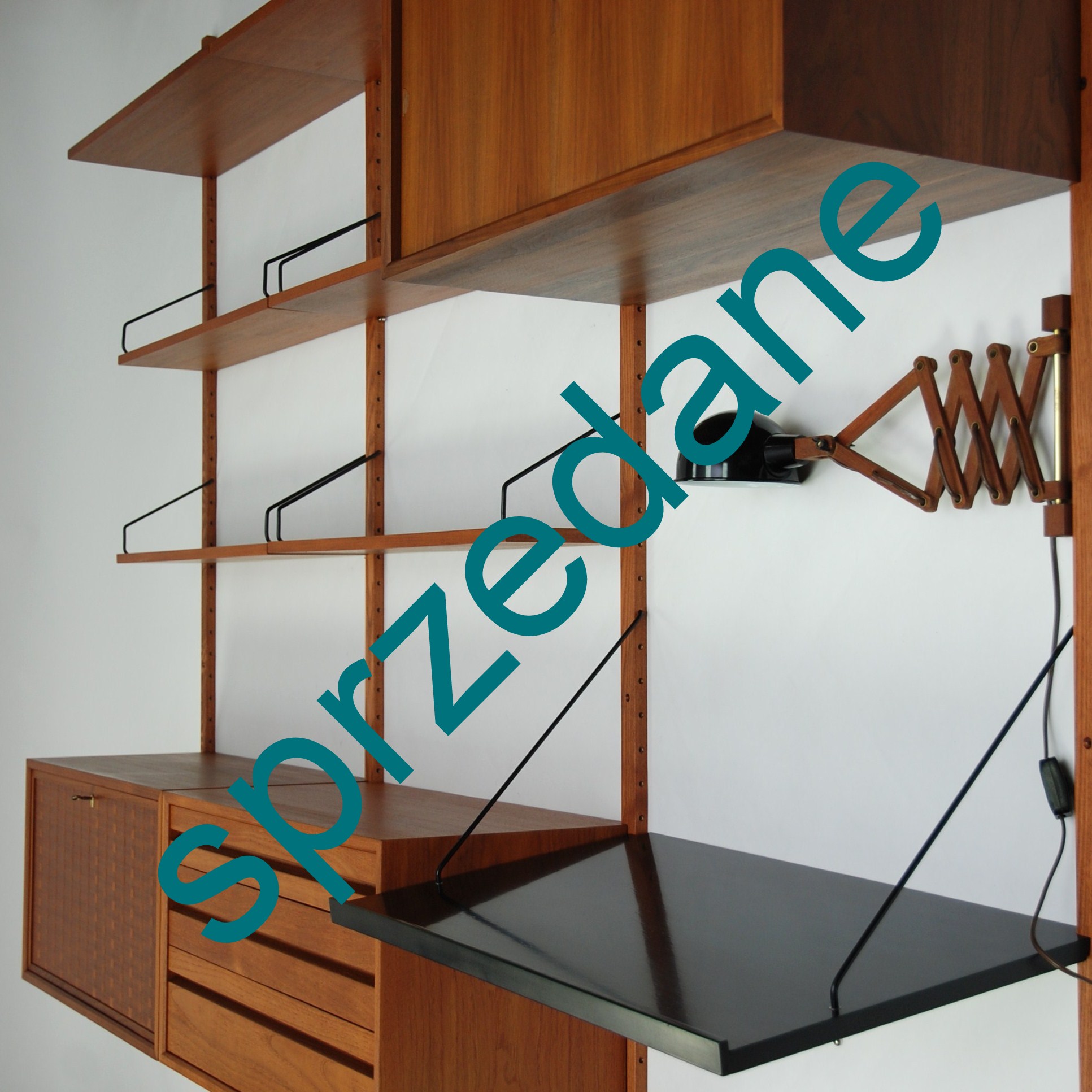 Modułowy system ścienny, projektu duńskiego architekta Poula Cadoviusa . Lekki przestrzenny mebel. Konstrukcja ażurowa o niezliczonej ilości kombinacji. Masz możliwość zmiany, kiedy tylko chcesz. Prostota elegancja i funkcjonalizm. Możliwe niewykorzystanie jednej listwy. Zagęszczamy pozostałe. Do biura i salonu. Fornir tekowy, olejowany. Listwy, jesion barwiony. Oryginalny produkt duński lat 60/70.
