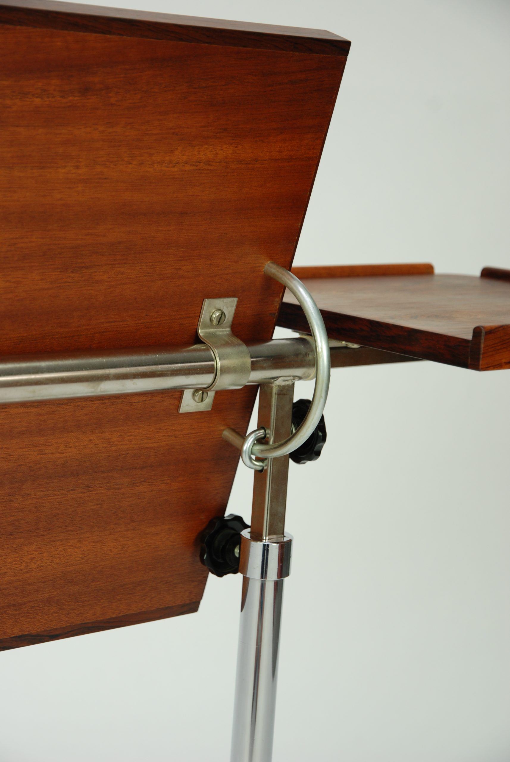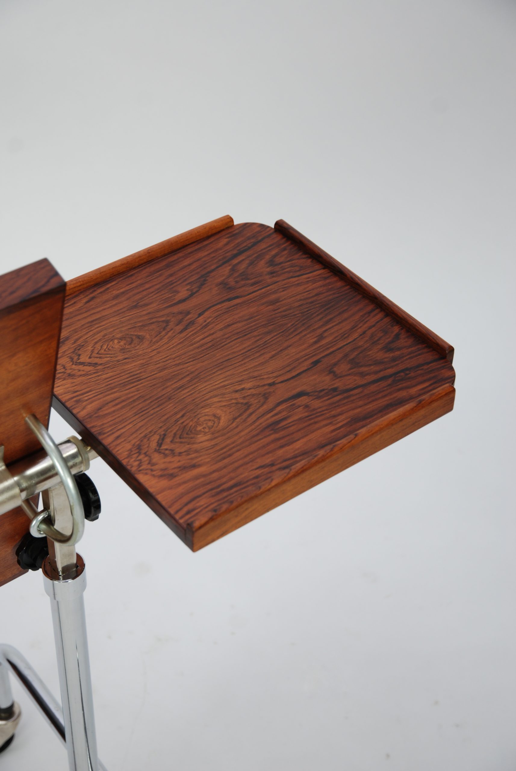 Pomocnik do czytania, do spożywania posiłku, do pracy. Dostawka do łóżka, kanapy albo fotela. Blat fornirowany naturalnym palisandrem. Doklejki/obrzeża z litego palisandru. Dowolna regulacja w pionie i poziomie. Z wyjątkiem małego blatu, który może być albo w poziomie albo w pionie. Stolik składany. Mebel z oferty ekskluzywnego domu handlowego ILLUMS BOLIGHUS.