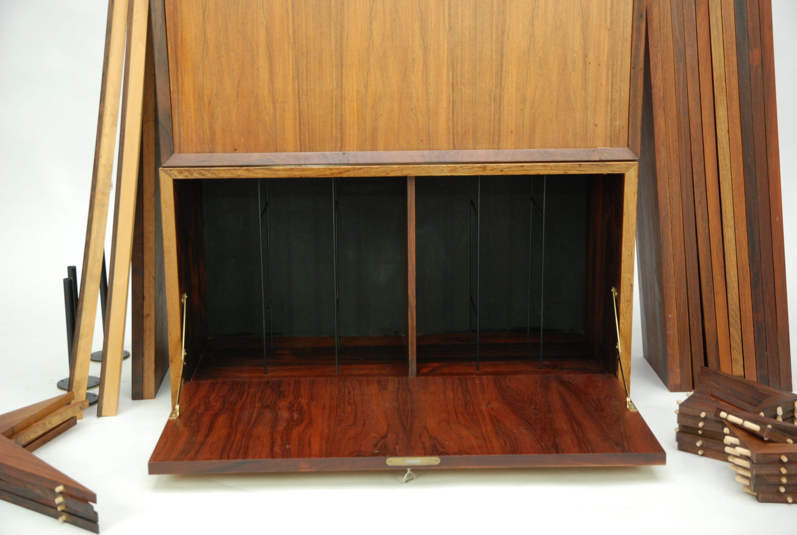 System CADO. Projekt POUL CADOVIUS. Prestiżowy regał modułowy. Bogaty w detalach (jeden z piękniejszych). Mebel wolnostojący stanowiący rodzaj przepierzenia/parawanu. Trzy belki rozporowe (montowane podłoga -sufit). Element montuje się tyłem do siebie. Powstają dwie sekcje. Sposób montażu zaprezentowany jest na ostatnim zdjęciu. Szafka z sekretarzykiem. Szafka na wino. Wysoka jakość wykonania. Szybki montaż/demontaż (na stałe montujemy pionowe listwy). Dowolna kombinacja ułożenia poszczególnych elementów. Funkcja biurka. Fornir palisandrowy. Wsporniki i listwy z masywu palisandru. Produkt duński lat 60-tych. Absolutny unikat.