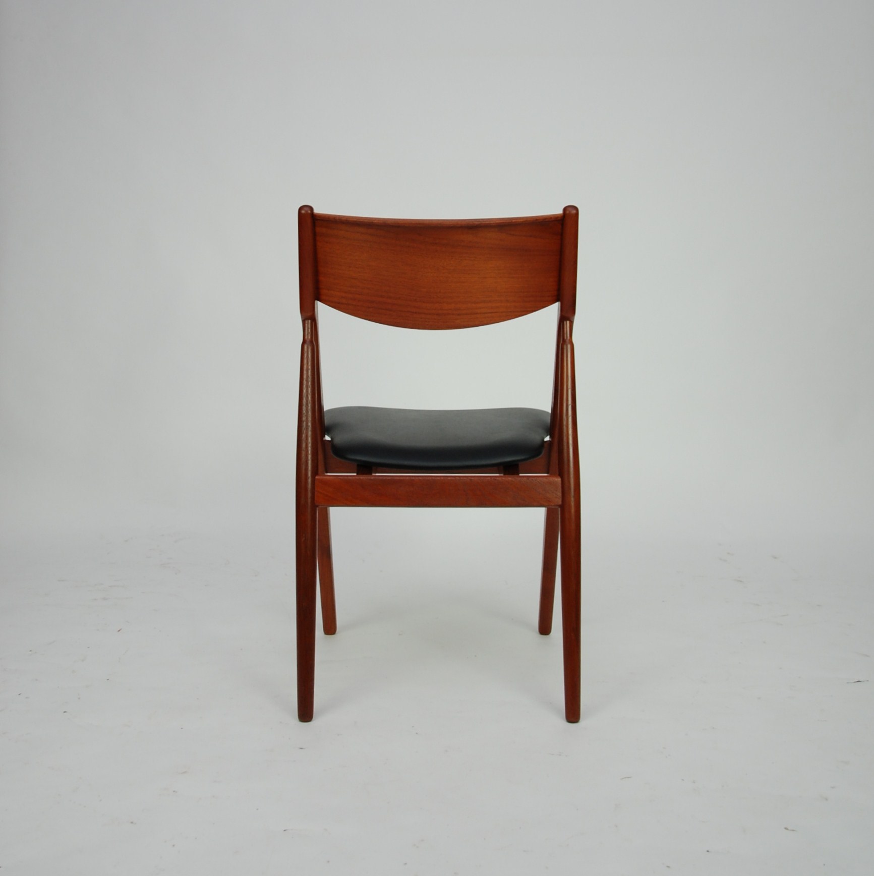Unikatowe krzesło tekowe. Wyrafinowana minimalistyczna forma. Zmyślna konstrukcja. Lity tek olejowany. Oparcie ze sklejki fornirowanej. Poszycie ze skóry sztucznej. Wyjątkowy produkt lat 60 - tych.