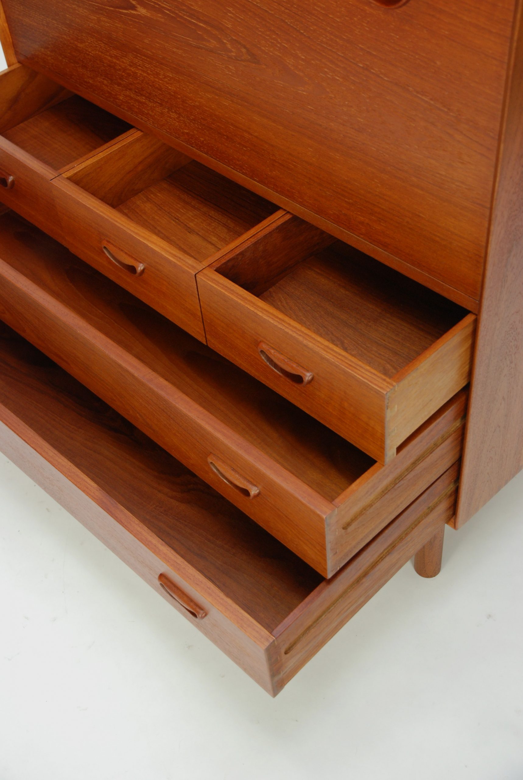 Piękny, modernistyczny sekretarzyk z wytwórni SOBORG. Projekt PETER HVIDT i ORLA MØLGAARD. Ultra nowoczesna forma lat 60-tych. Niespotykana ilość masywu tekowego (produkcja wysokobudżetowa). Fronty szuflad, drzwiczek i dna fornirowana tekiem. Reszta to lity tek (skrzynia, szuflady i pochwyty). Drewno olejowane. Unikat.